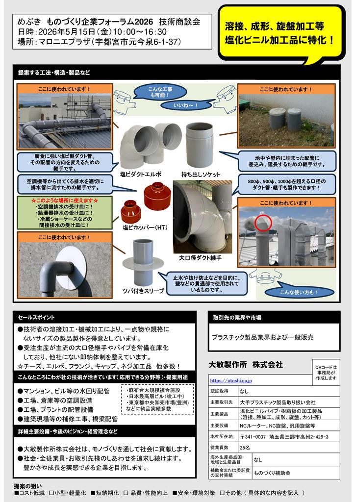 めぶき ものづくり企業フォーラム2026 に参加 大敏製作所は、めぶき ものづくり企業フォーラム2026 に参加いたします。 日時:2026年5月15日(金) 10:00 ~ 16:30 場所:マロニエプラザ (宇都宮市元今泉6-1-37)
